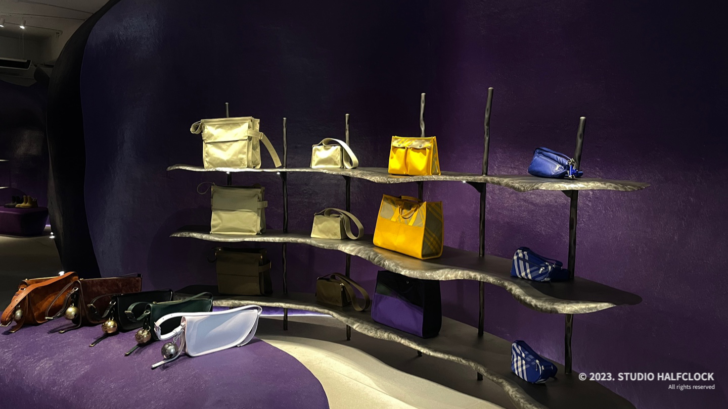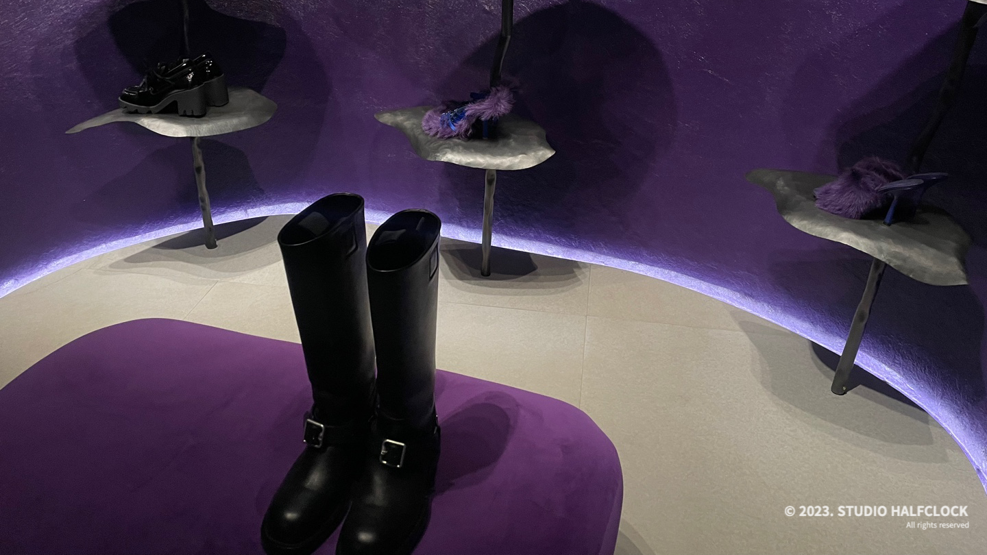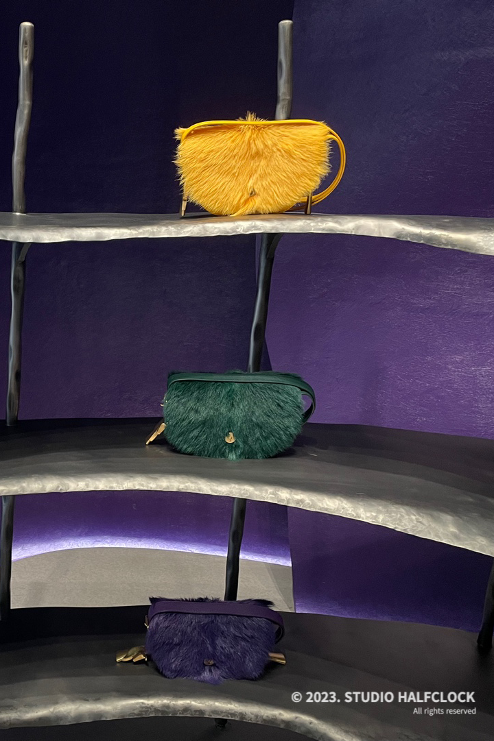 장미의 잎을 연상시키는 벽 형태와 강렬한 보라색, 보라색으로 전체를 꾸민 건 예뻤는데 살짝 눈이 피로했다. 잘못하면 가방과 옷이 잘 안 보이는.. 공간이 너무 강렬해서.. 특이한 가방과 퍼재질의 가방들을 볼 수 있었고, 디스플레이 매대가 전부 곡선이라서 보는 재미가 있었다.