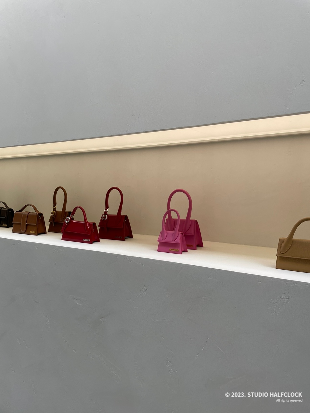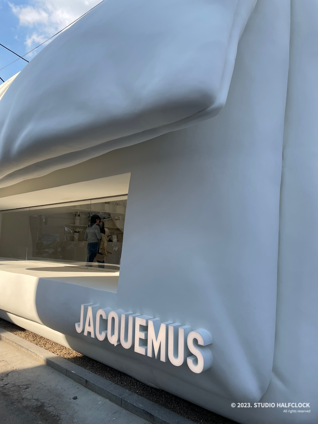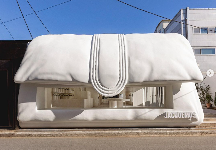 가방형태로 건물을 만들어버린 자크뮈스, 너무 예쁘고 독특해서 사람들이 건물 앞에서 사진을 많이 찍었다. 자크뮈스 팝업스토어 10일밖에 안 하는 거 좀 아쉽다. 들어가면 위쪽에 뚫린 창으로 자연광이 들어와 은은하게 공간을 밝혀줘서 좋았다. 자크뮈스의 팝업스토어는 외관에 좀 더 신경 쓴 느낌이었다.