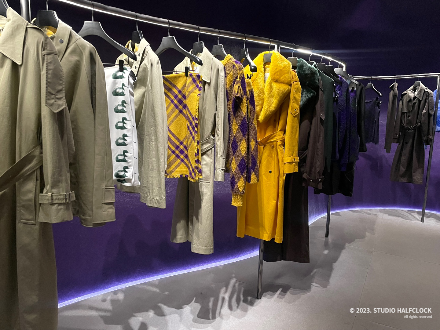 공간이 보라색이다 보니, 노란색 옷들이 눈에 띄었다. 버버리는 트렌치코트로 유명하지 않나요..? 아무튼 그래서 그런지 트렌치코트가 많았음. 조금 많이 마음에 들었던 노란색 오리 패턴의 치마. 검정과 노란색은 항상 잘 어울린다. 자세히 보니 오리 프린트인 게 너무 귀여웠음.