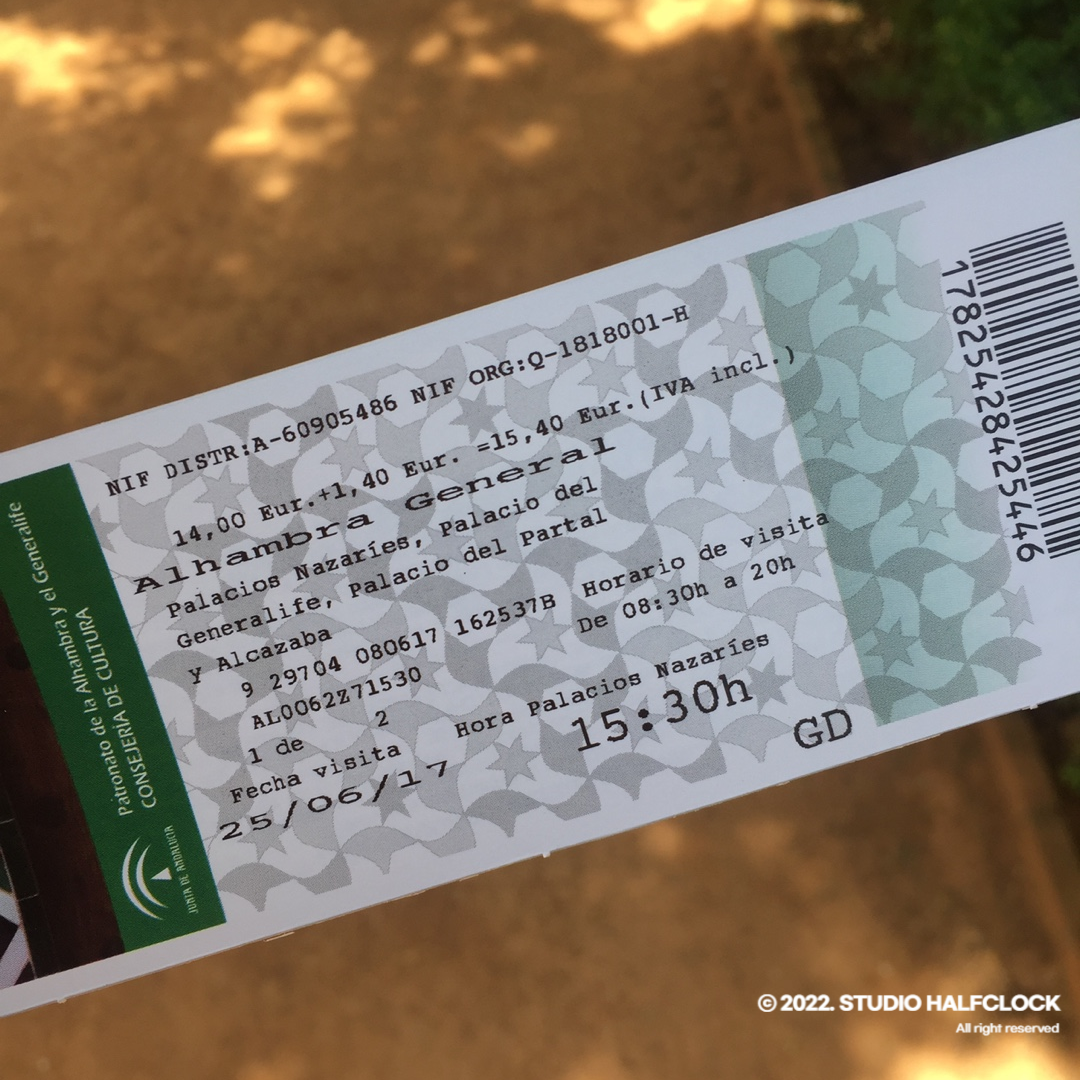 당시는 2017년도 6월, 스페인 남부의 그라나다 지역을 돌아볼 때 꼭 방문해야 할 건축물로 알람브라 궁전을 정했다. 스페인의 6월 날씨는 정말 좋았다. 살짝 덥긴 했지만 습하진 않아서 적당했다. 스페인을 방문할 예정이라면 5~6월 날씨가 적당히 더워서 좋은 듯하다. 알람브라 궁전은 월요일이 휴관이고 일요일은 오후 3시 반에 닫기 때문에 꼭 화요일에서 토요일에 봐야한다. 궁전의 크기가 많이 크기에 다 돌아보기에 평균적으로 3시간 이상 소요된다. 티켓은 15.40 EUR이고 시간별로 입장 티켓을 살 수 있다.
