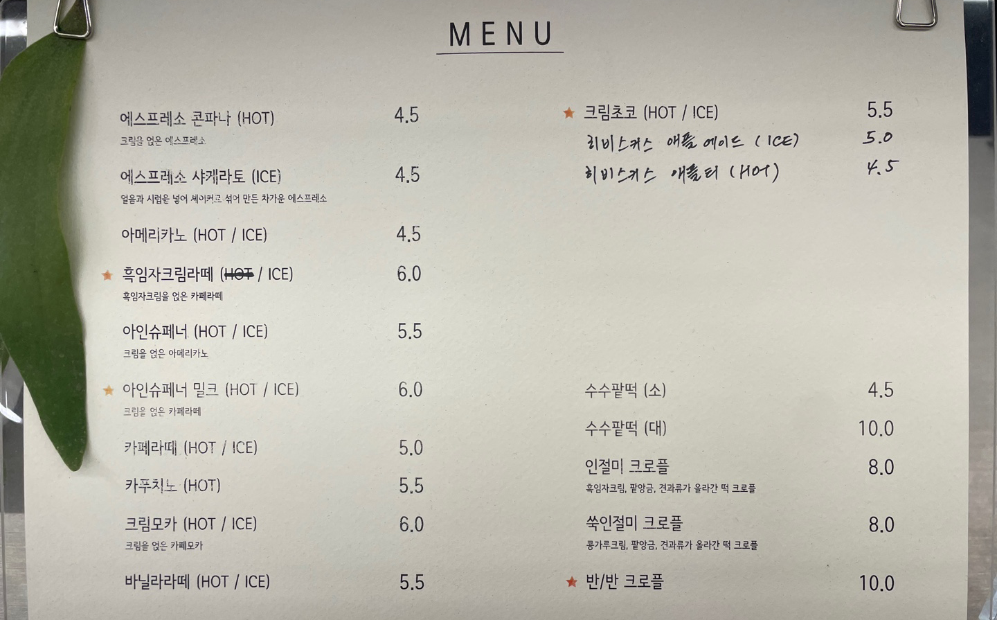 메뉴는 디저트종류가 더 추가될 예정이라고 해요. 가오픈 상태라고 합니다. 인절미 크로플이 맛있어 보여서 먹고 싶었지만 근처에서 밥을 많이 먹고 와서 패스.. 카페 돌아다니면서 살만 찌는 듯..