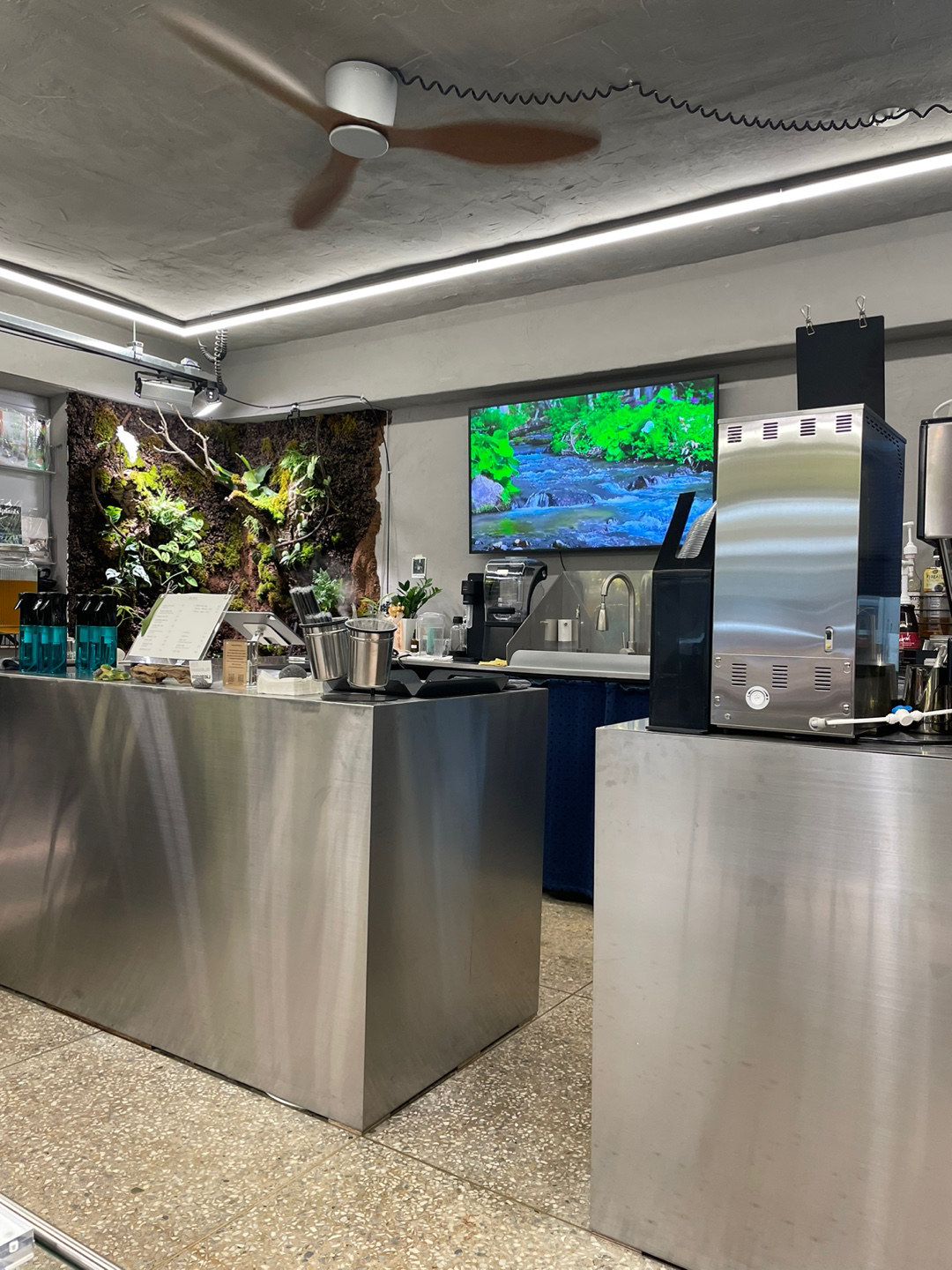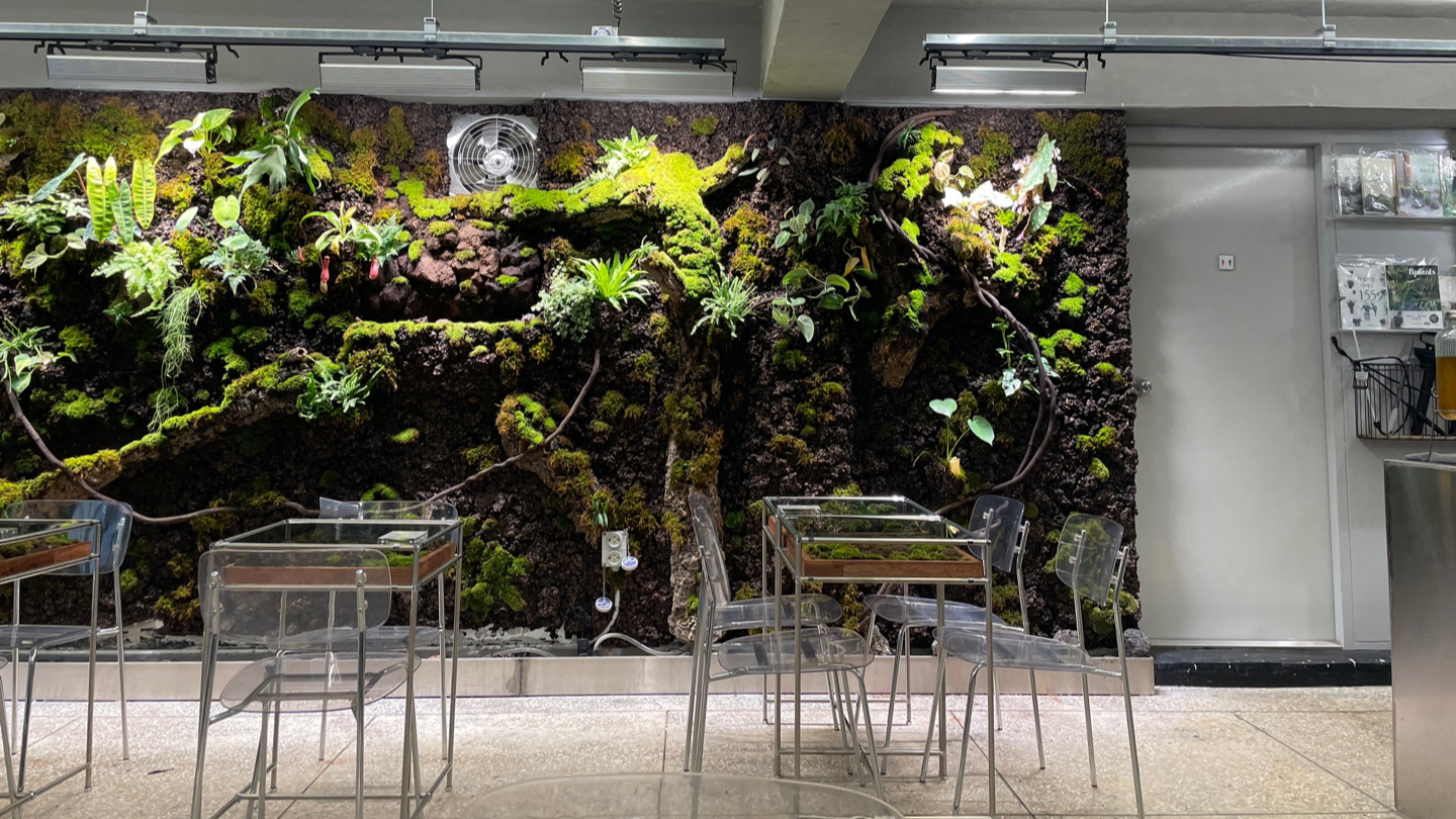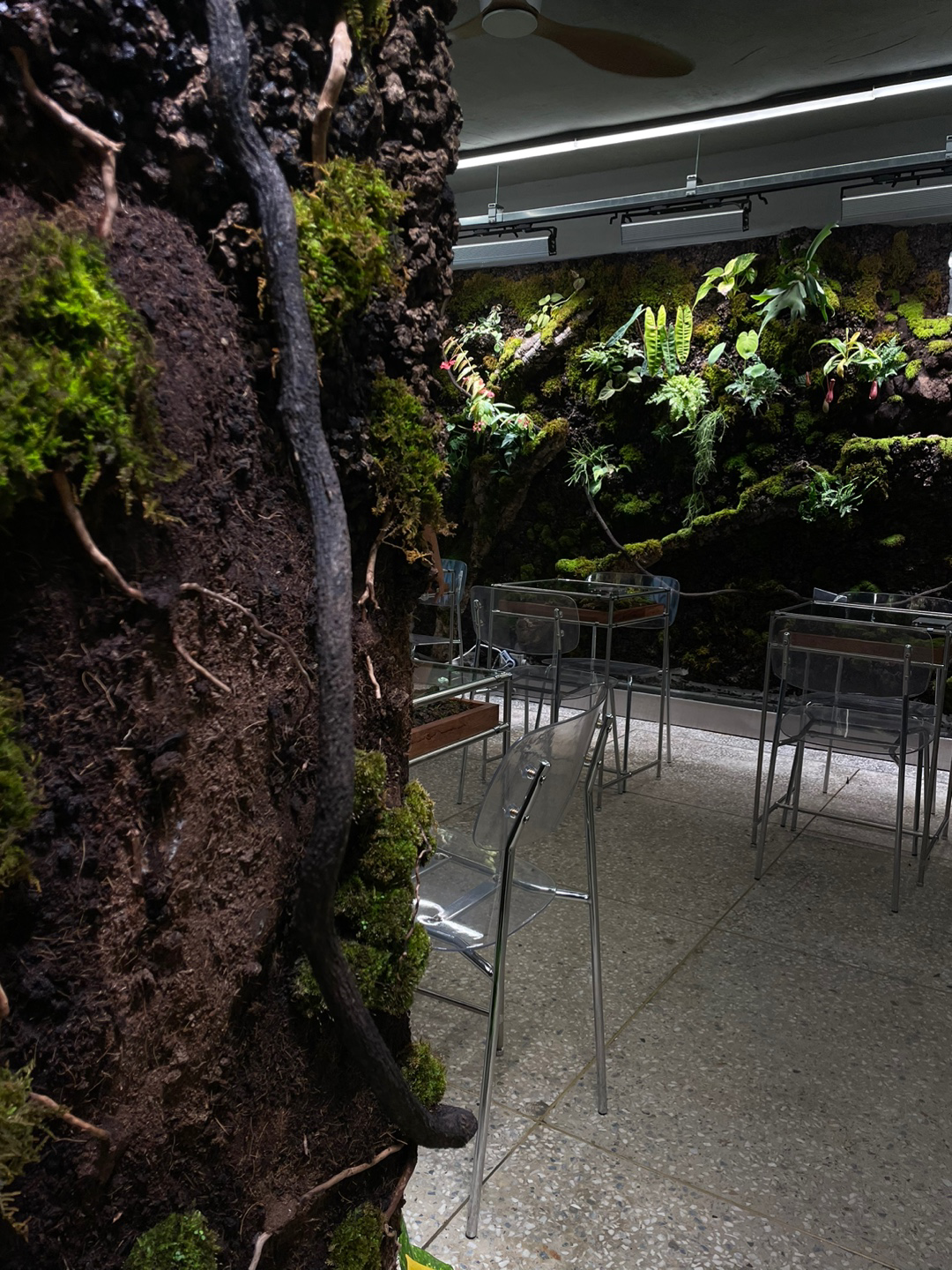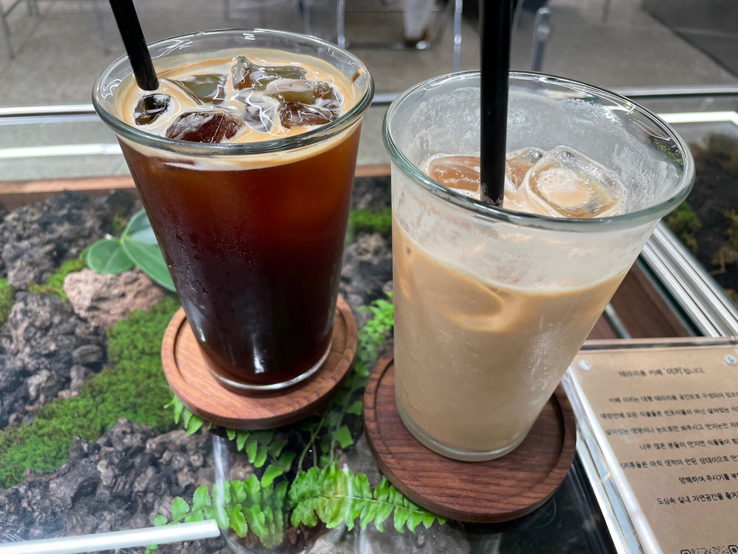 테라리움 안에 들어와 있는 듯한 느낌을 주는 카페 내부 인테리어, 카페가 작아서 오히려 흙냄새를 잘 맡을 수 있다. 이런 게 진정한 플랜테리어가 아닐까..? 화분 몇 개 배치하고 플랜테리어라고 하는 경우가 많아서.. 들어가자마자 느껴지는 습도와 흙냄새는 자연을 시각, 촉각, 후각으로 제대로 보여줌. 내부 벽을 차지하고 있는 흙과 이끼, 식물들은 모두 진짜 식물들로 물뿌릴수도 있습니다. 분무기 주신다. 도심에는 식물이 별로 없어서 산소농도가 조금 떨어진다고 하잖아요..? 여기는 내부에 식물이 많아서 그런지 정신이 맑아지는 느낌이 있습니다.