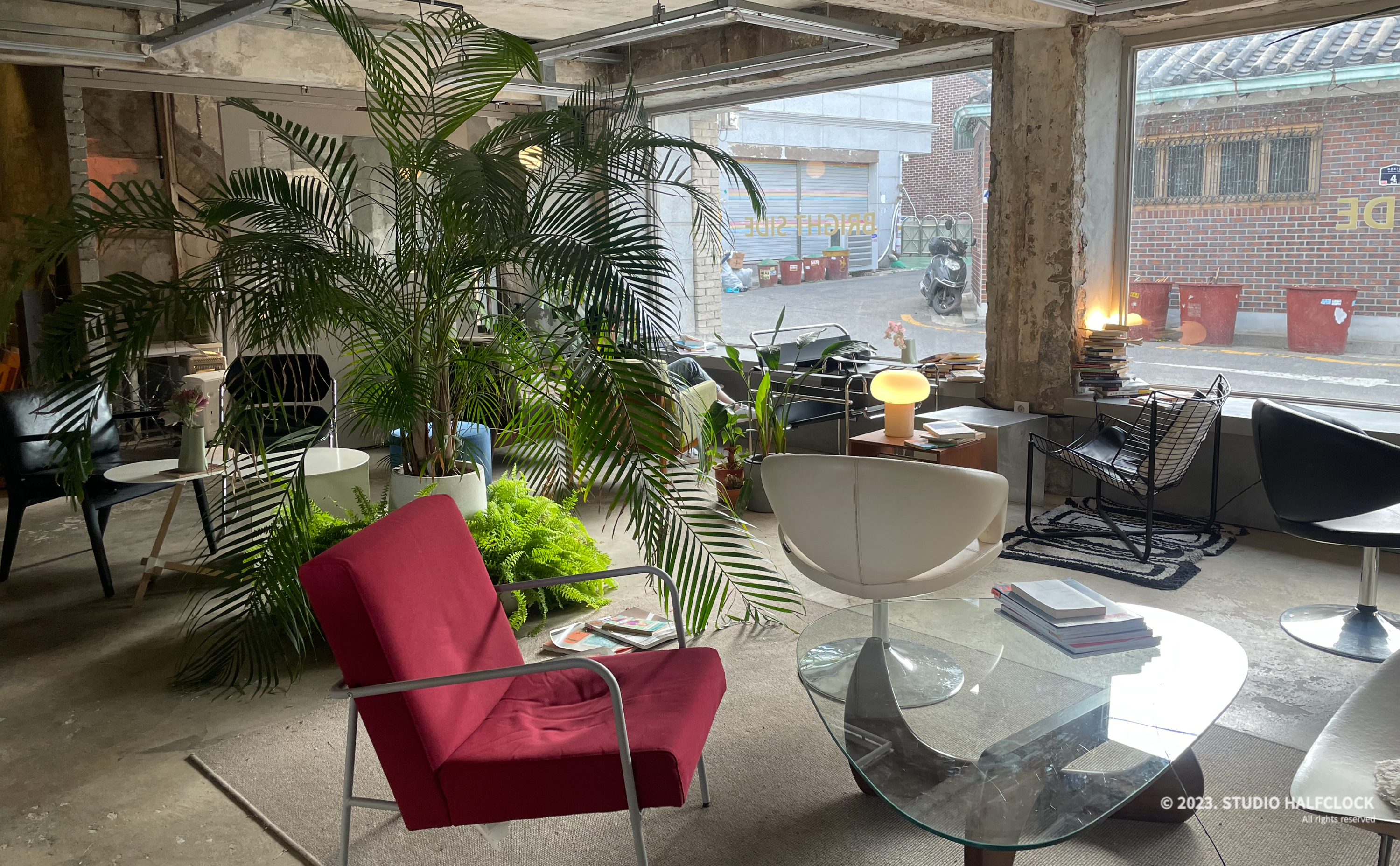 노출 벽과 식물들이 어우러지고 통유리창을 통해 자연광이 들어와 차갑게 느껴질 수 있는 공간을 따뜻하게 만들었다.