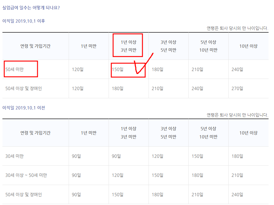 1년 이상 3년 미만에 속하고 50세 미만으로 150일을 수령가능합니다.