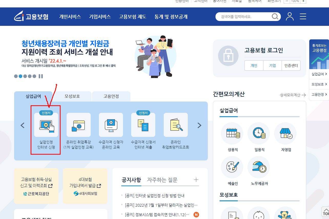 로그인 후 실업인정 인터넷 신청을 눌러줍니다