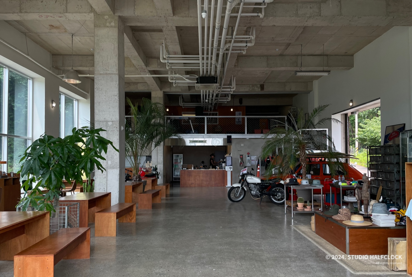 층고가 높아서 개방감이 확! 거기다 오른쪽 입구는 완전 차고느낌이었어요. 카페 내에 오렌지색 자동차와 오토바이가 있는데, 좀 더 차고 느낌을 직접적으로 줬습니다.