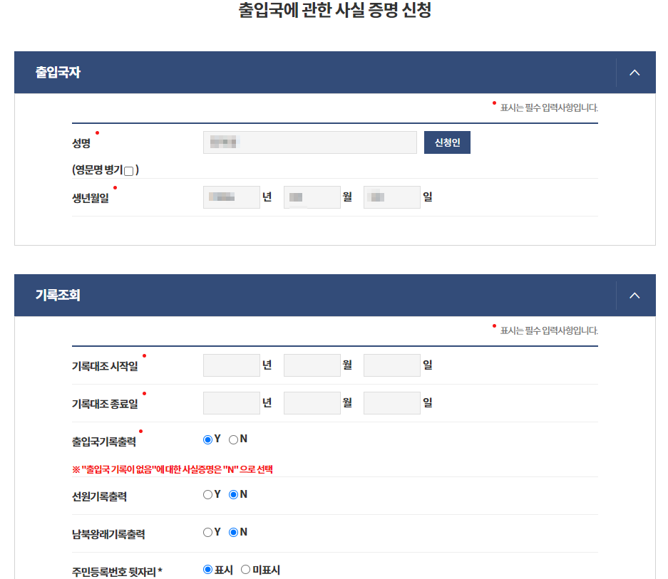 그럼 이렇게 사실증명신청 폼이 나옵니다. 여기에 이름과 생년월일, 기록대조 시작일과 종료일 (이 안에 여행날짜가 들어가야 합니다.) 거기에 주민등록번호 뒷자리는 표시/미표시해도 됩니다.
