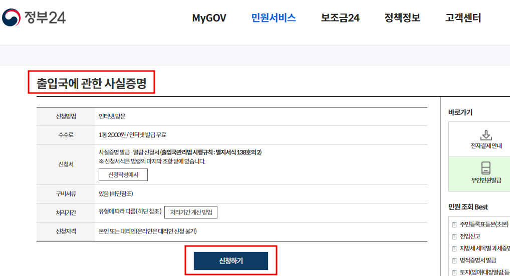 출입국 사실 증명서는 처음 발급받아보는데, 인터넷으로 발급하면 무료지만 직접 방문해서 발급하면 2000원 수수료를 내야 한다. 인터넷 발급이 어렵지 않으니 집에서 발급해 봅시다.