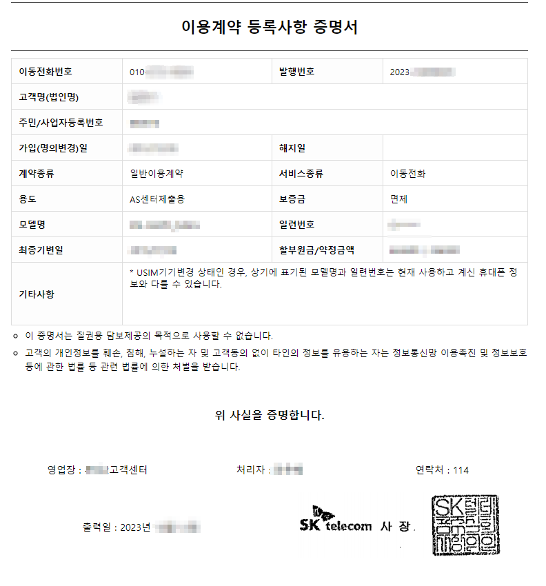 이 부분은 통신사마다 달라서 SKT기준으로 114에 연락하여 이용계약 등록사항 증명서를 발급받았습니다. 보험사에 청구할 거라고 말하면 알아서 필요한 서류를 보내줍니다.