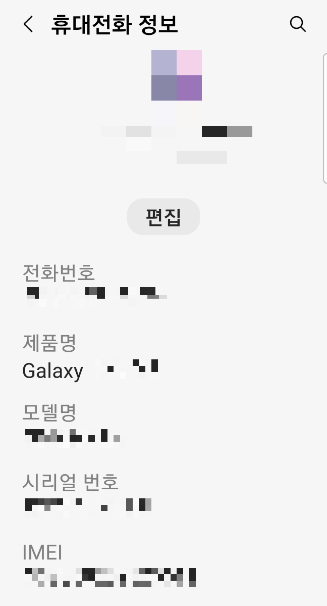 2번은 쉽습니다. 저희 어머니 핸드폰이 삼성꺼라서 그냥 환경설정 들어가서 휴대전화 정보를 들어가면 제품명과 모델명, 시리얼 번호, IMEI까지 다 나와있었습니다. 이 화면을 캡처해서 보내면 됩니다.