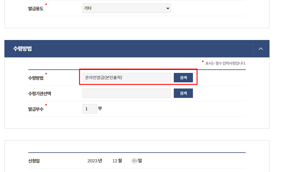온라인 발급으로 되어있는지 확인하고 아래에 발급신청을 눌러줍니다.