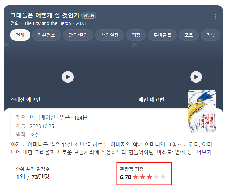 지브리 스튜디오의 창시자, 미야자키 하야오 감독의 신작인 '그대들은 어떻게 살 것인가'를 보러 갔다. 미야자키 하야오가 10년 만에 만든 작품으로 23년 10월 25일 국내 개봉했다. 특히 메이킹 필름을 보고 굉장히 기대가 많이 되었는데, 개봉 후 평점이 좋지 않아서 이 영화를 볼지 고민을 많이 했다. 결국 그냥 안 보는 게 나았을 것 같다. 오랜만에 극장에 가서 본 영화인데 정말.. 재미없었다. 같이 간 친구는 심지어 졸았던 지브리 영화 중 최악인 것 같다. 내가 보러 가자고 한 영화라서 같이 간 친구한테 미안했음. 감독의 이름 때문에 사람들이 많이 보긴 하는 것 같지만 정말 비추하는 영화. 영화를 보는 내내 이게 무슨내용인지 고민하게 하는 영화는 처음이었다. 결국 돈과 시간이 아까웠던 영화.
