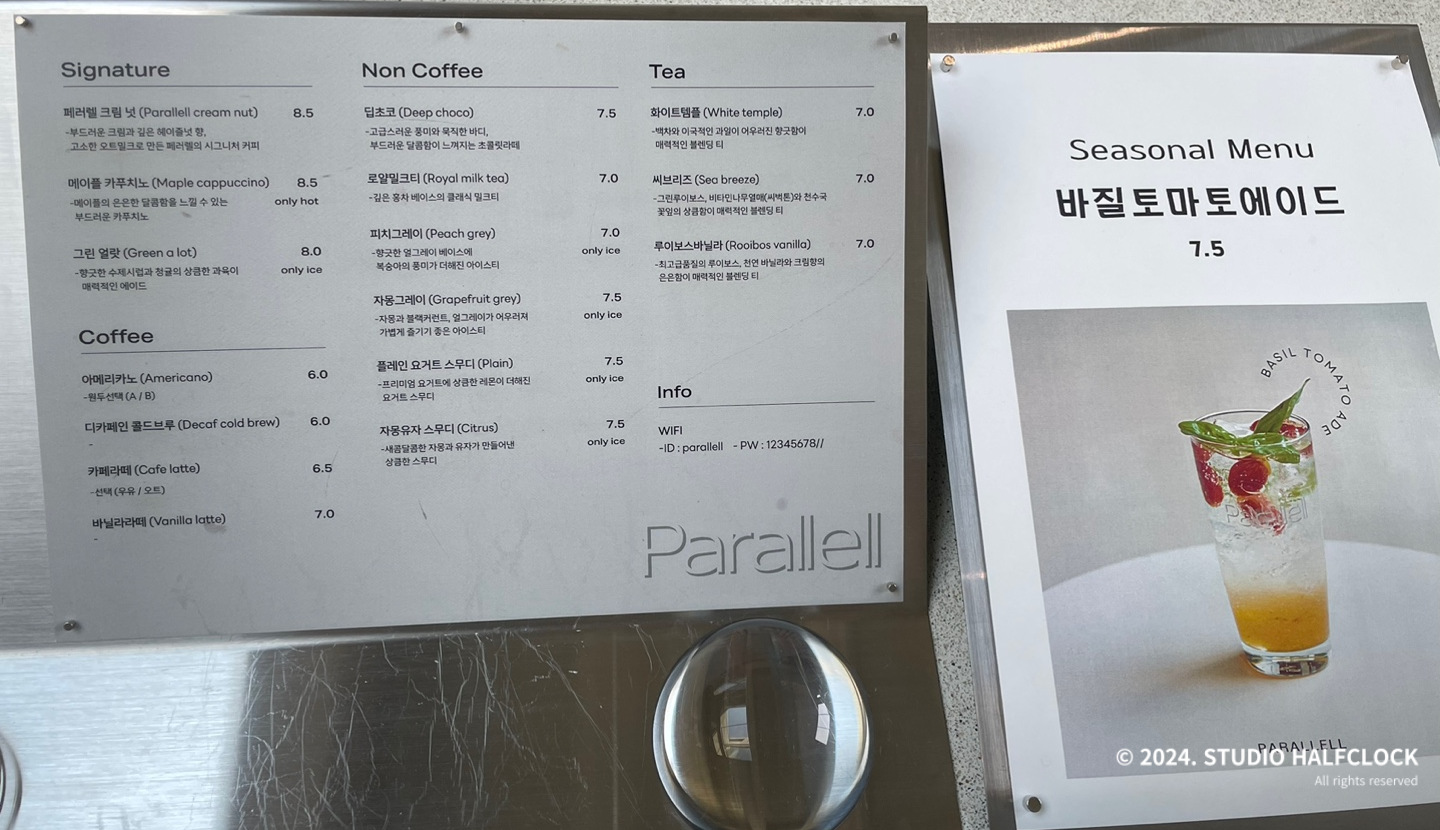 시그니처 메뉴인 페러렐 크림 넛을 주문해 봤습니다. 음료 메뉴는 가격대가 조금 있는편이에요. 커피를 좋아하신다면 원두 선택해서 아메리카노 드시는 것 추천드려요. 디카페인 콜드브루도 있습니다. 논커피 메뉴가 다양하게 많아서 커피 선택전에 살짝 갈등이 옵니다. 티종류도 많아요.