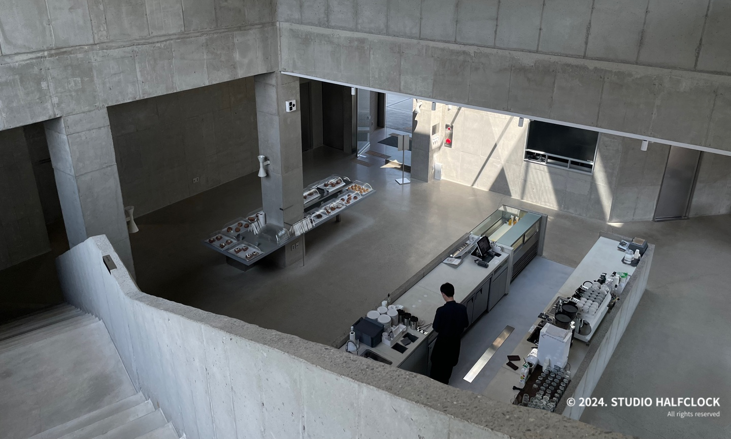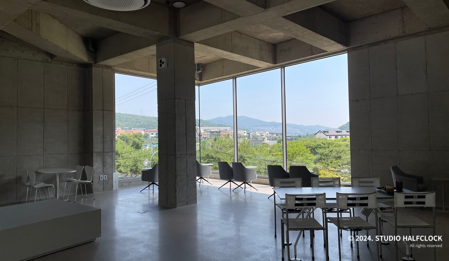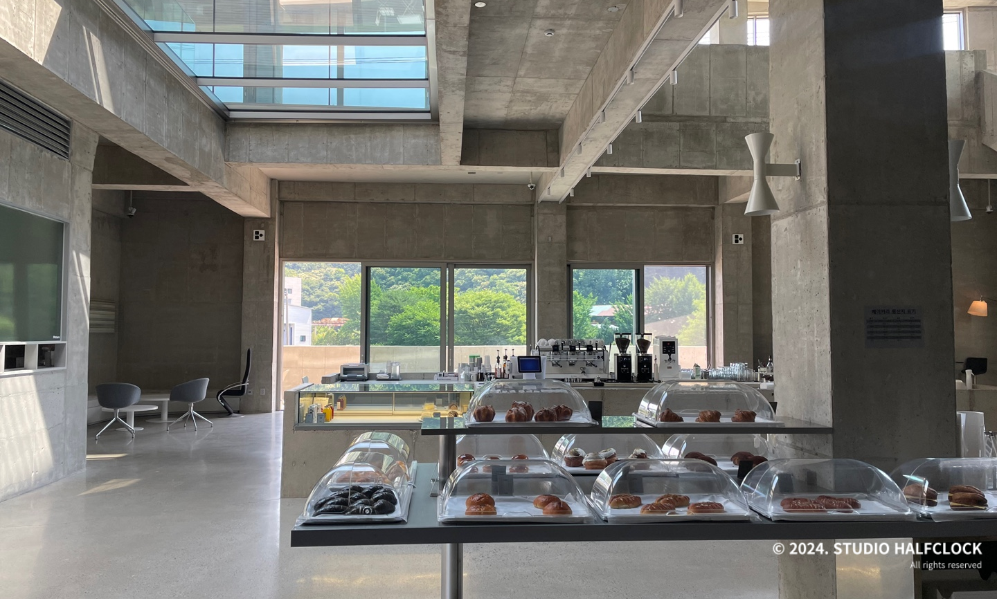 용인 처인구 모현에 위치한 대형 단독 카페로 한적한 위치에 멋진 건물로 이목을 끈다. 사실 보자마자 건축회사에서 사옥으로 지은 건가라고 생각이 들 정도로 카페 설계에 신경을 많이 쓴 게 느껴졌다. 총 3개의 층으로 1,2층은 카페, 3층은 루프탑이 있다. 노출콘크리트 이용으로 질리지 않으면서 유리를 적절히 활용하여 주변의 산과 논을 전망으로 한다. 오전에 갈만한 카페를 찾다가 오전 10시, 꽤 일찍 오픈하는 카페가 있어서 우연히 가게 되었는데, 건축이 멋있어서 글을 쓰게 됐습니다. (근데 빵도 정말 맛있었음)