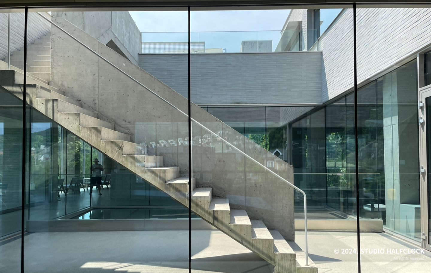 중앙에 위치한 중정. 중앙에 문을 열고 나가서 계단을 통해 루프탑으로 갈 수 있어요. 중정을 통해 1, 2층에 자연광이 유입돼서 좋은 듯.