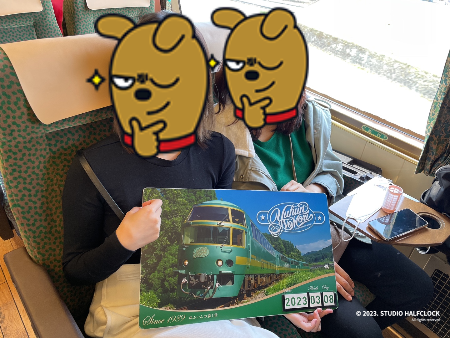 그 후 15분 정도 지났나..? 역무원이 유후인 노모리가 프린트된 큰 카드를 주고 사진을 찍어준다.