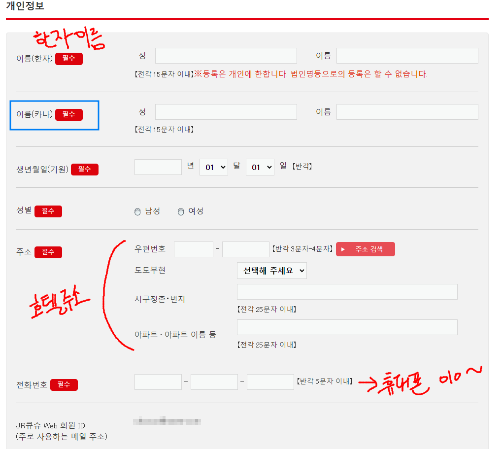 그렇게 일본어로 된 이름을 적어주시고 일본 내 주소는 예약한 호텔로 적어주세요.