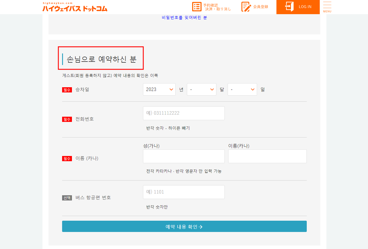 예약 정보를 입력해 줍니다. 승차일과 전화번호 이름을 입력하고 예약 내용 확인으로 넘어갑니다.