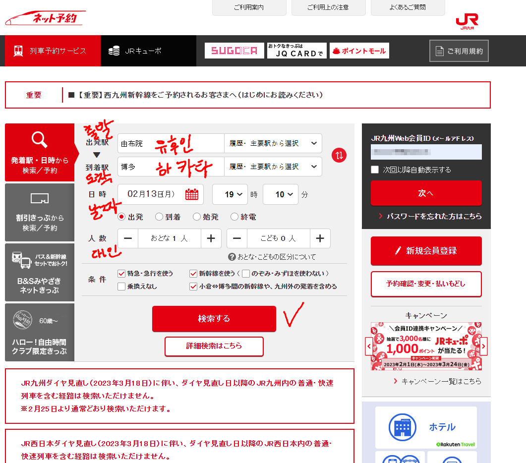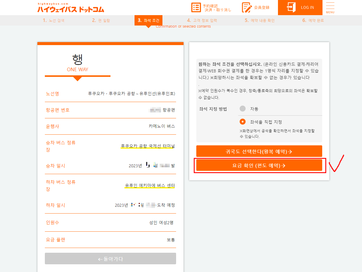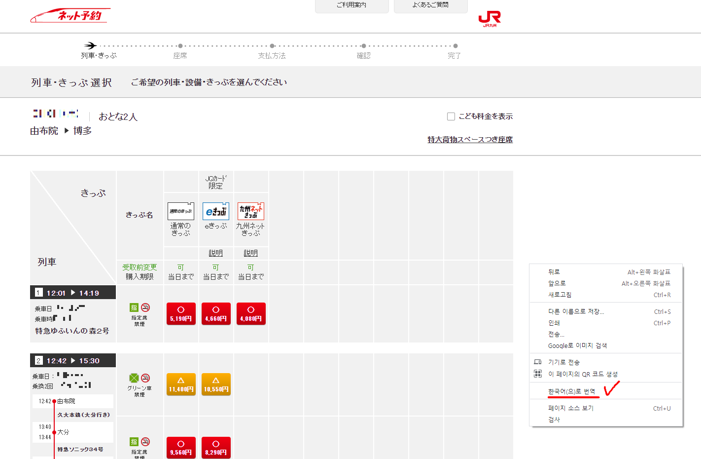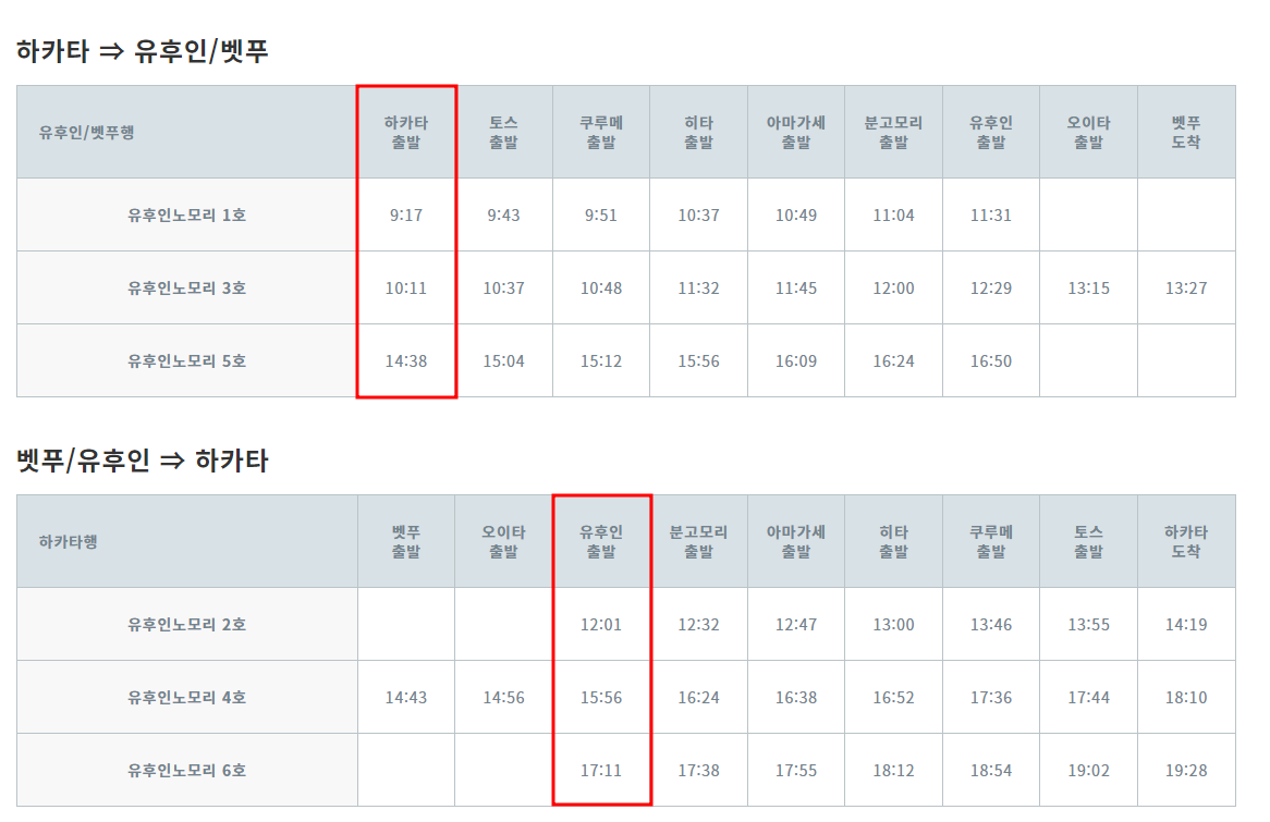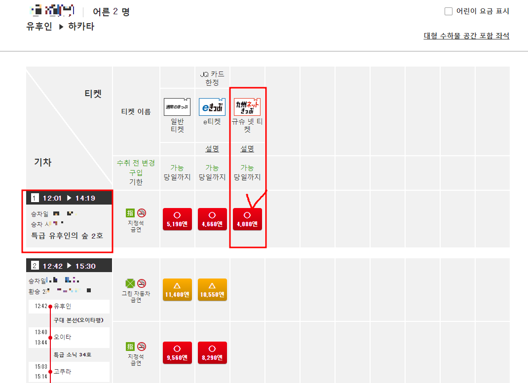 저는 출발지 (유후인) - 도착지 (하카타)로 예약했습니다.