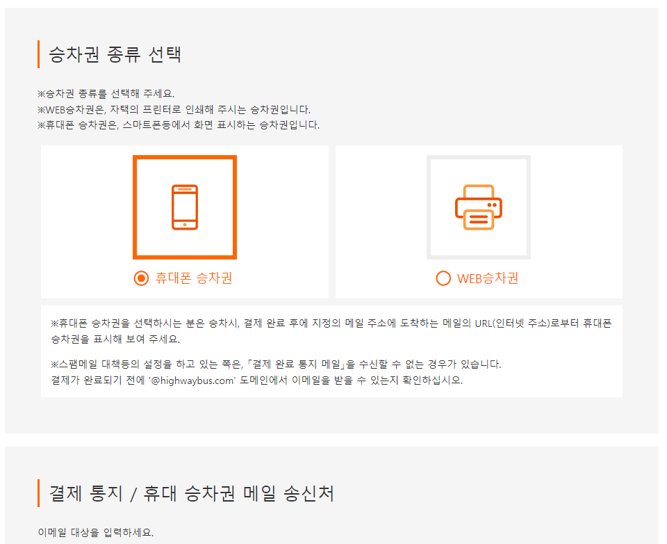 승차권은 휴대폰 승차권과 WEB승차권으로 고를 수 있어요. 저는 프린트하기 싫으니깐 휴대폰 승차권으로 선택했습니다.