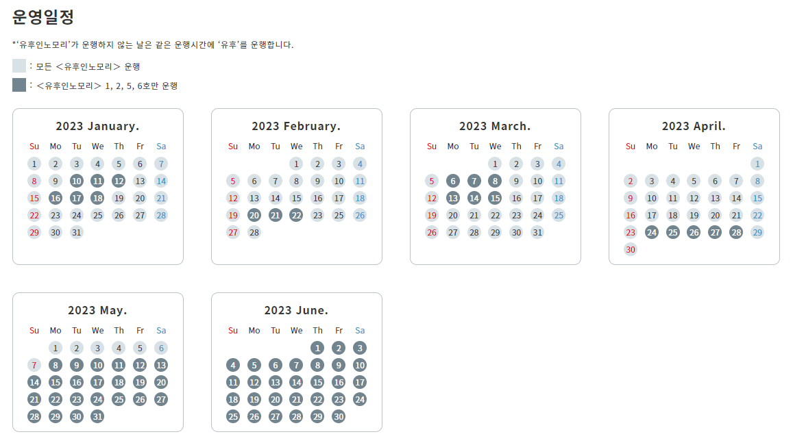 확실히 온천마을로 유명한 유후인이라서 1월부터 4월까지는 많이 운행하지만 5월부터는 적게 운행하는 걸 알 수 있습니다.