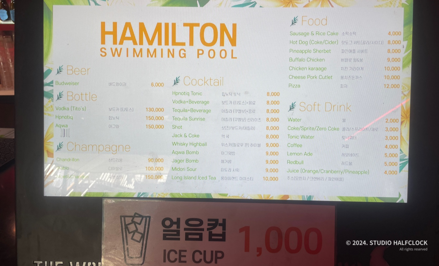 수영도하고 태닝도 하다 보면 시간이 금방 가는데요, 간단하게 먹을 수 있는 음식도 판매합니다. 음식가격이 그렇게 비싸지 않아서 정말 좋았어요! 가끔 수영장이라고 너무 비싸게 파는 경우도 봤는데 나름 합리적입니다.