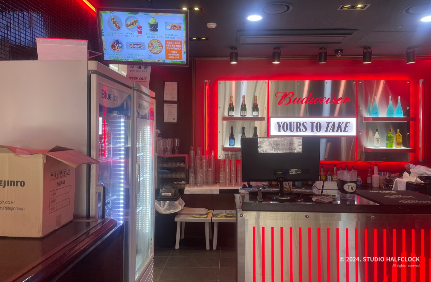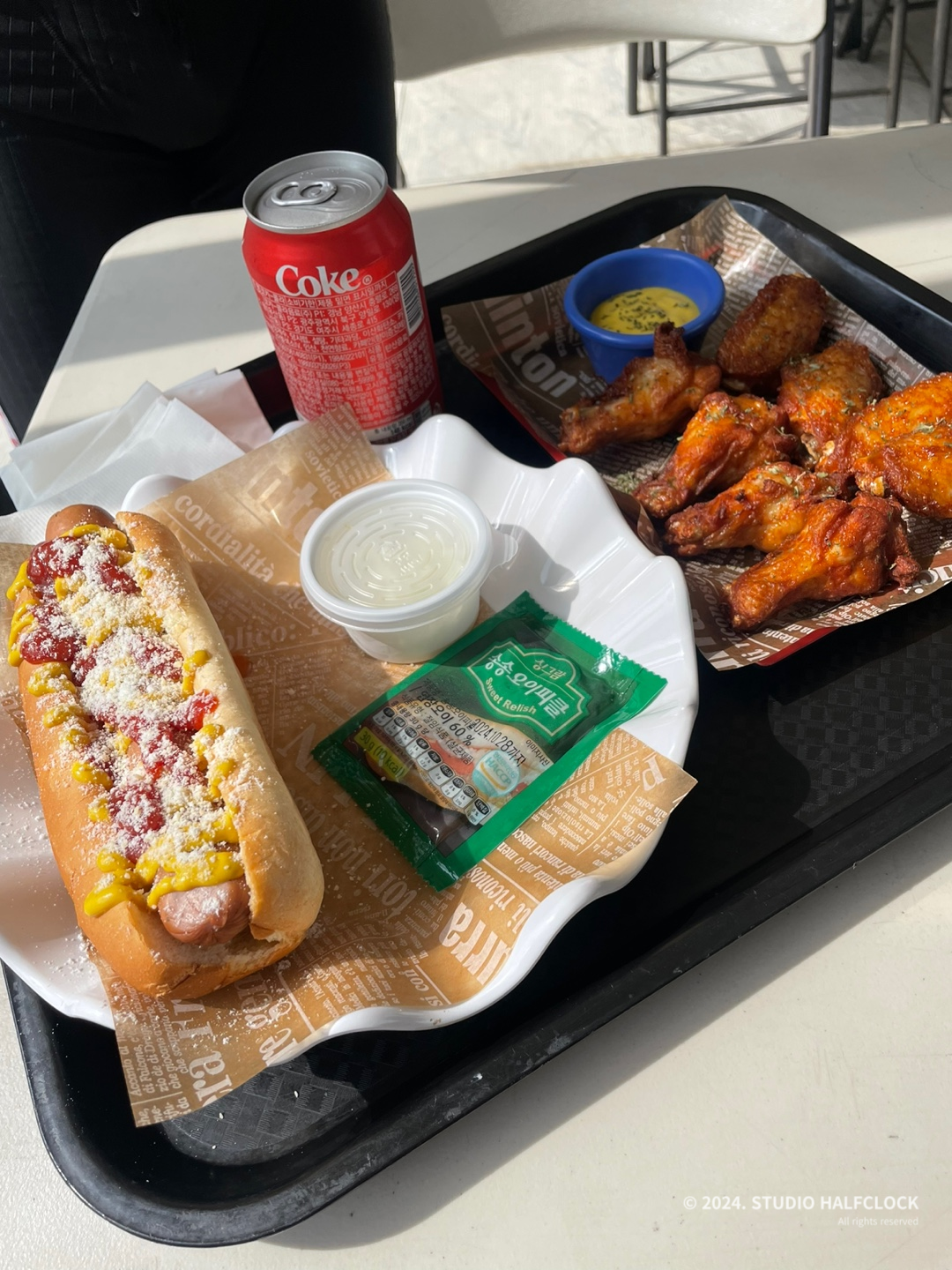 올 때마다 먹는 버팔로 윙봉.. 정말 맛있어요..! 핫도그 세트는 콜라랑 세트입니다. 너무 더우면 얼음컵(1,000원) 구매해도 좋아요! 음료는 맥주, 칵테일, 샴페인 등 다양하게 있습니다.
