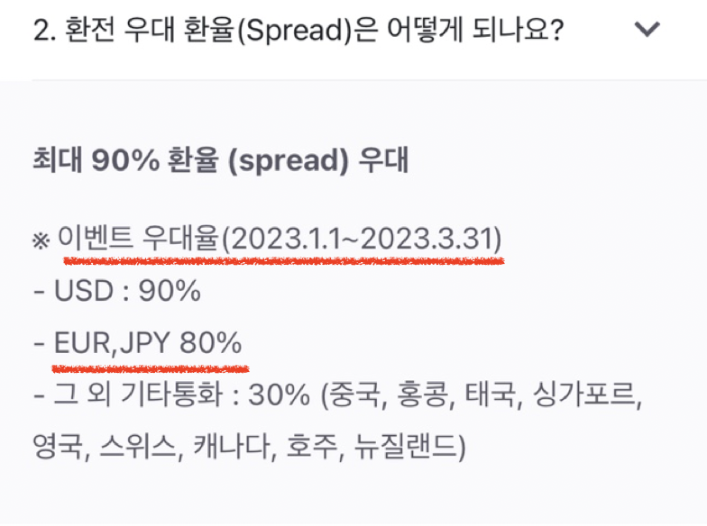 - 2023.1.1 ~ 2023.3.31: 이벤트 우대율 적용 중 (USD: 90%, EUR, JPY: 80%)