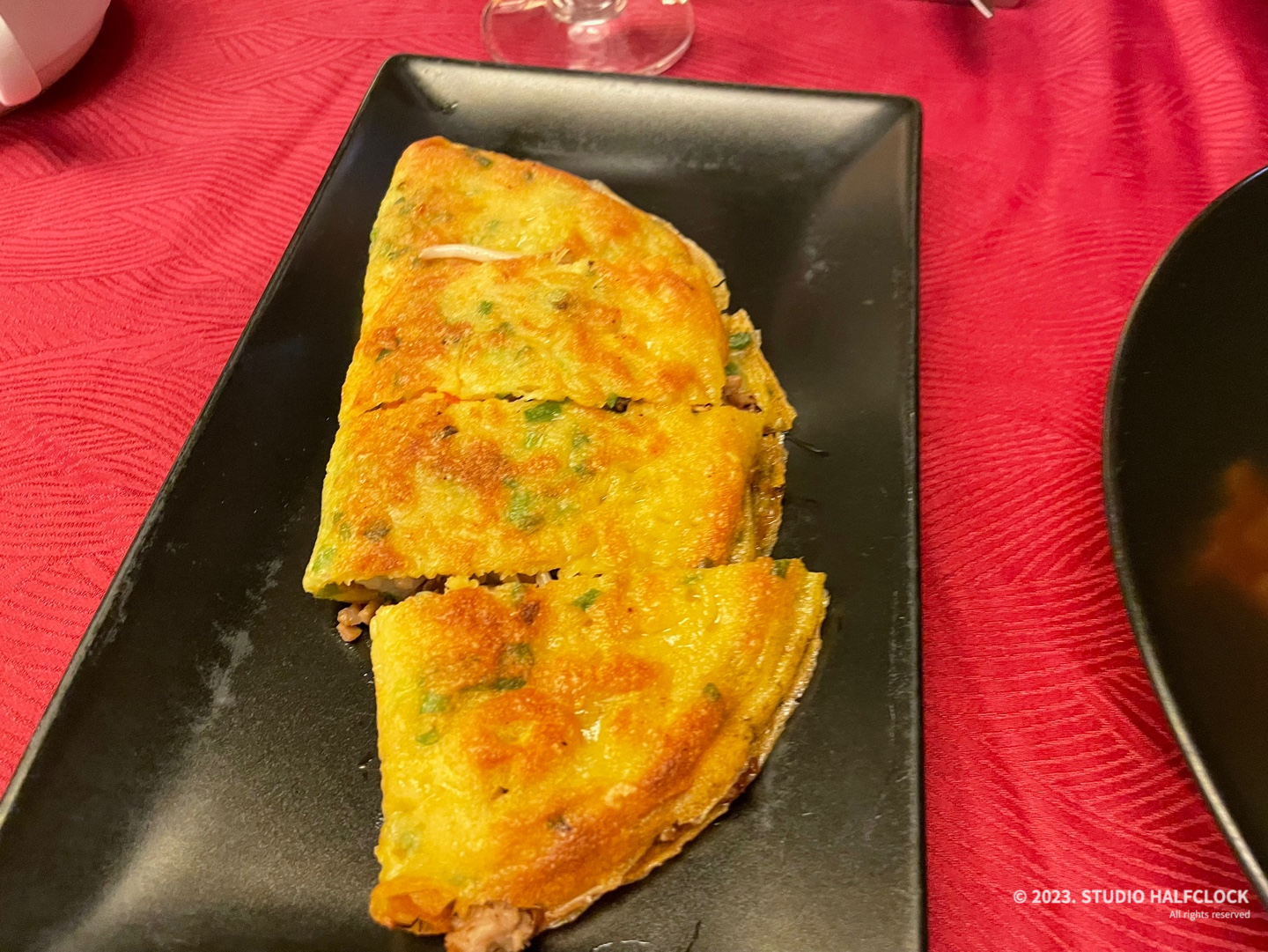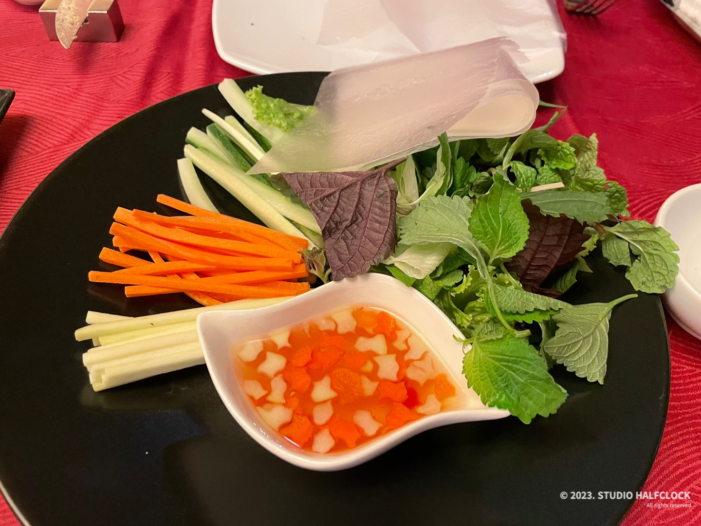 베트남의 팬케이크라고 (한국식으로 전) 불리는 반쎄오. 깔끔하게 나와서 좋았어요. 라이스페이퍼는 정말 얇아서 물에 묻혀서 먹는 게 아니라 소스에 찍어먹는 겁니다. 다양한 야채랑 베트남식 전을 라이스페이퍼에 싸서 먹으면 정말 맛있어요.
