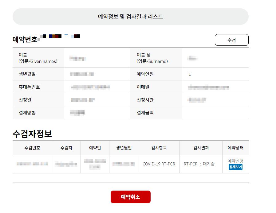 저는 이렇게 예약을 해놨었는데, 결국 검사예약을 취소하고 3차 백신을 맞았네요. 그래서 PCR검사 예약취소를 했습니다.