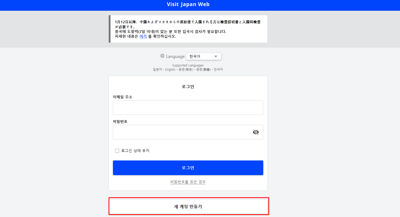 비짓재팬 웹사이트에 들어가면 가장 먼저 회원가입을 해줘야 합니다. 새 계정 만들기를 눌러주시고 본인의 이메일주소와 비밀번호를 입력해 주고 이메일 인증을 받으면 끝입니다. 아주 간단하니 금방 진행하시면 됩니다.
