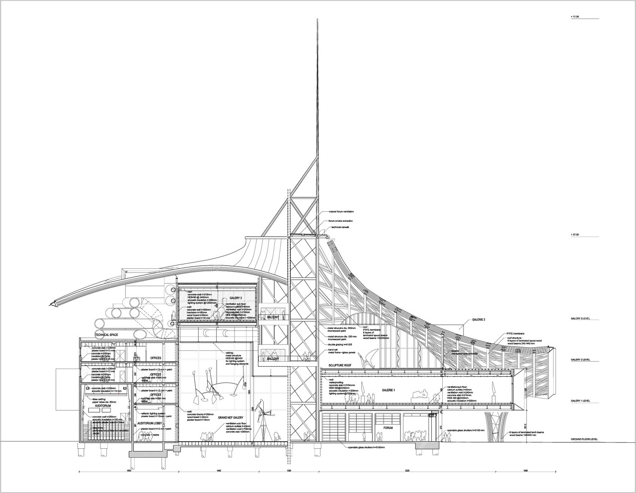 반 시게루는 이 건축물을 설계할 때 기능 공간에 포커스를 맞추었다. 명확하고 간단한 볼륨으로 해결하였는데, 사각 튜브 3개를 만들었다. 3개의 갤러리 튜브 외에 다른 부속 기능을 하는 원형 볼륨, 사각형 볼륨들이 쌓여있다. 육각형 형태의 목조 지붕 구조는 모든 분리되어있는 부피를 하나의 건물로 통일시켜주기 위해 공중에 떠 있다. 프랑스인들에게 육각형은 지리적 모양과 비슷하여 프랑스의 상징이다.