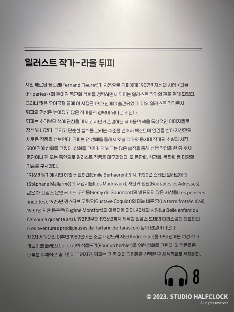 도슨트를 통해 라울뒤피의 작품세계에 대해 자세하게 알 수 있어서 좋았다. 라울 뒤피의 초기 작품부터 정말 다양한 분야의 예술까지 다양한 작품을 감상할 수 있는 좋은 전시였다. 회화 작품이 적게 느껴져서 아쉬웠지만 그래도 다양한 작품들을 통해 라울뒤피를 다각도로 볼 수 있는 기회였다.