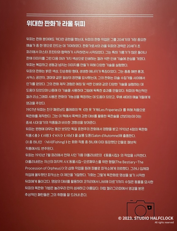 도슨트를 통해 라울뒤피의 작품세계에 대해 자세하게 알 수 있어서 좋았다. 라울 뒤피의 초기 작품부터 정말 다양한 분야의 예술까지 다양한 작품을 감상할 수 있는 좋은 전시였다. 회화 작품이 적게 느껴져서 아쉬웠지만 그래도 다양한 작품들을 통해 라울뒤피를 다각도로 볼 수 있는 기회였다.