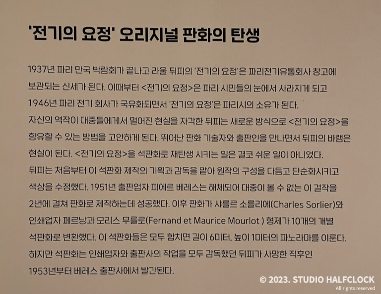 파리 만국 박람회가 끝난 후 라울 뒤피의 '전기의 요정'은 시민들의 눈에서 사라지게 된다. 이를 자각한 뒤피는 새로운 방식으로 <전기의 요정>을 향유할 수 있는 방법을 고민하게 되고 이 작품을 석판화로 재탄생시키게 되었다.