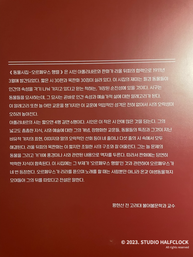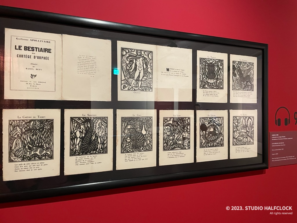 1907년 친구 페르낭트 플레뢰의 책 <헌 옷 가게>를 위해 처음으로 목판화를 제작했고 1910년 파리에서 <동물시집>의 작업을 시작했다. 원래 파블로 피카소에게 의뢰했는데 입체파 작업에 몰두했던 피카소는 이 제안을 거절했다. 그렇게 뒤피가 작업을 하게 되었는데, 명암의 대비를 이용하여 수많은 동물을 묘사하고 추상적인 패턴들을 섬세하고 아름답게 그려냈다.