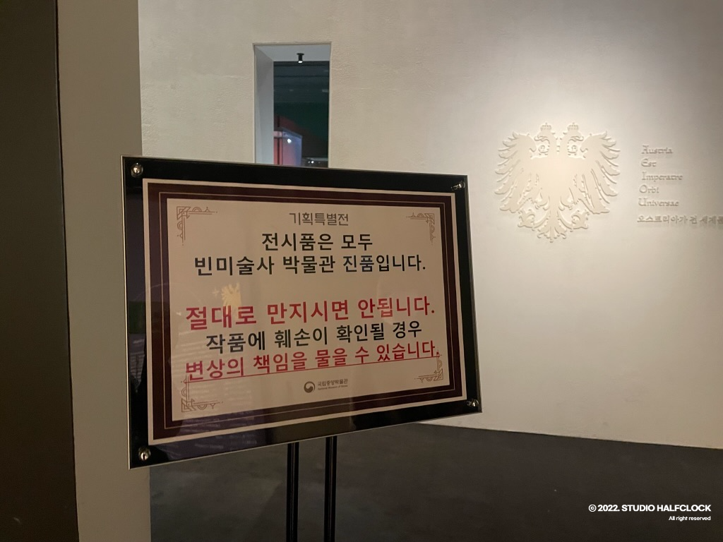 전시장의 입구에서 사람들이 많이 사진을 찍었다. 들어가는 입구에는 전시품들이 모두 빈미술사 박물관의 진품이라는 말과 함께 절대로 만지면 안 된다는 경고가 적혀있다. 아무래도 진품이기 때문에 한번 더 관람객들에게 주의를 요청하는 듯하다.