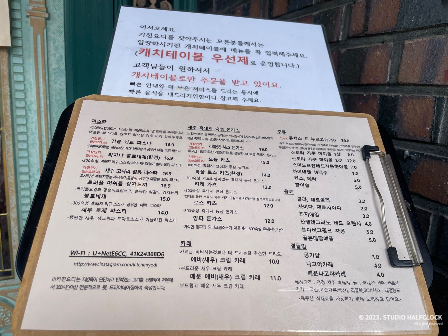 키친요디는 밖에서 보기에는 단독주택처럼 되어있는데 내부는 정말 깔끔했다. 주차는 건물 앞에 작게 한 대정도 가능한 것 같고 골목에 위치하고 있어서 주차자리 찾기가 조금 어려웠다. 제주삼화지구 먹자골목거리 2분 거리에 위치하고 나름 공항 근처에 위치해서 제주도 여행 마지막날 오픈런해서 먹었다. 제주도에서 먹었던 흑돼지 관련해서 제일 맛있었던 곳! 거기에 파스타도 진짜 맛있어요! 키친요디 2호 점도 있으니 참고해 주세요! 사장님이 일본 유학하면서 배운 요리를 한국인 입맛에 맞게 만들었다고 합니다.