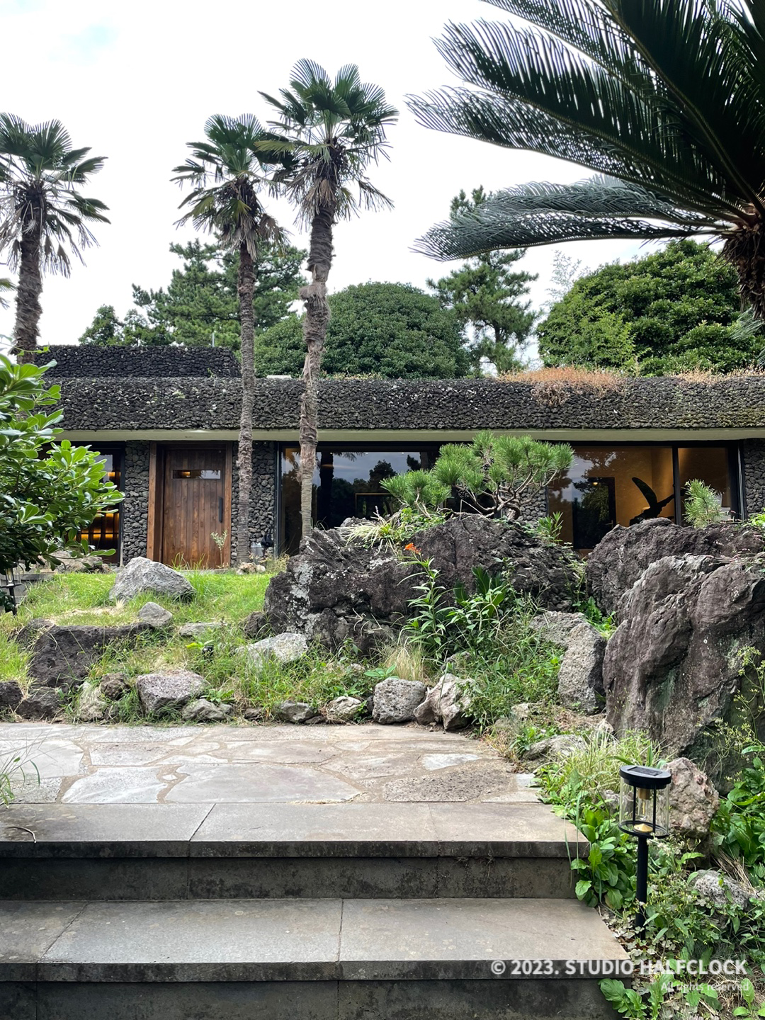 천천히 계단을 올라가면 드디어 카페가 보입니다. 카페가 주차장에서 그렇게 멀지는 않지만 조경을 구경하다가 시간이 조금 걸렸네요. 원통형 조명들은 날이 어두워지면 켜지는데 베트남에 온듯한 느낌을 줍니다. 주변 야자수들과 어우러져 멋있어요. 카페는 1층짜리 건물로 제주도의 현무암을 그대로 표현한 느낌이네요. 주변 조경을 가리지 않고 잘 어울립니다.