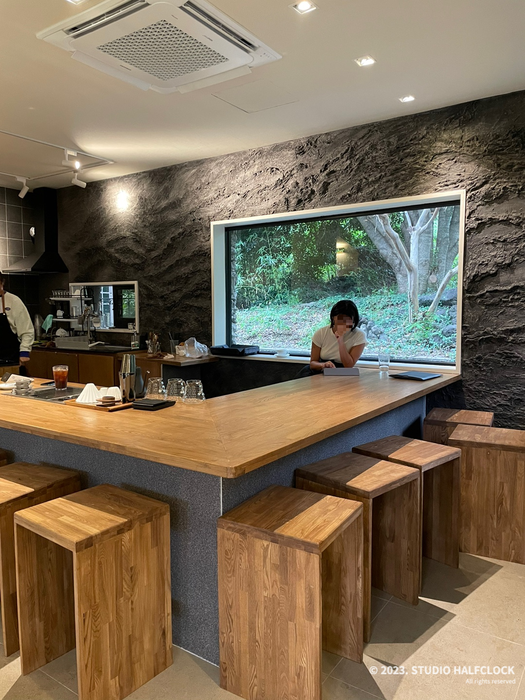 밖의 조경을 보면서 커피나 와인을 즐길 수 있습니다. 날씨도 좋고 조경이 멋있어서 밖에서 커피 한잔 하기에도 좋습니다. 메뉴를 주문하는 곳은 바형태로 되어 있고 현무암 벽으로 포인트를 줬습니다. 요새 커피와 바를 같이 하는 곳이 많아진 것 같아요.