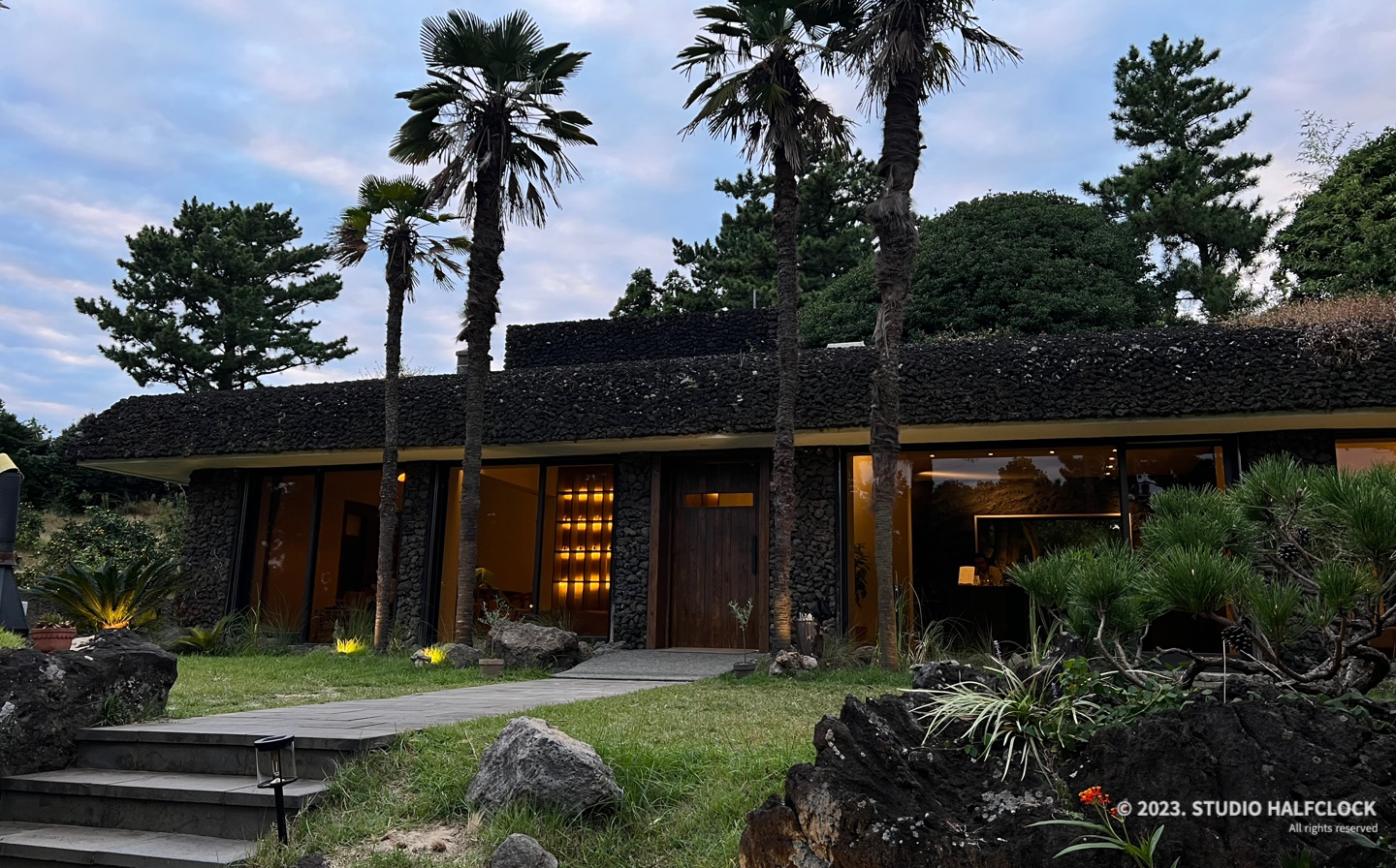 천천히 계단을 올라가면 드디어 카페가 보입니다. 카페가 주차장에서 그렇게 멀지는 않지만 조경을 구경하다가 시간이 조금 걸렸네요. 원통형 조명들은 날이 어두워지면 켜지는데 베트남에 온듯한 느낌을 줍니다. 주변 야자수들과 어우러져 멋있어요. 카페는 1층짜리 건물로 제주도의 현무암을 그대로 표현한 느낌이네요. 주변 조경을 가리지 않고 잘 어울립니다.