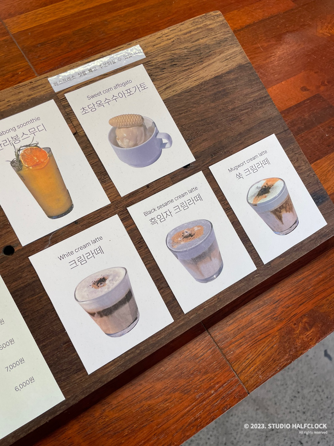시그니처 메뉴가 다양해서 좋았어요. 여기가 초당옥수수아포가토를 팔아서 찾게된 카페였는데 정말 맛있었습니다. 다양한 시그니처 메뉴가 있는데, 저는 흑임자 크림라떼와 쑥 크림라떼 중에서 고민을 많이 했어요. 고소한 걸 마시고 싶어서 결국 흑임자 크림라떼를 주문했습니다. 쑥 크림라떼 못 먹어본 게 조금 마음에 걸리네요. 맛있어 보이던데.. 디카페인 커피는 없다고 합니다. 시그니처 메뉴에서 샷을 안 넣을 수는 있다고 해요.