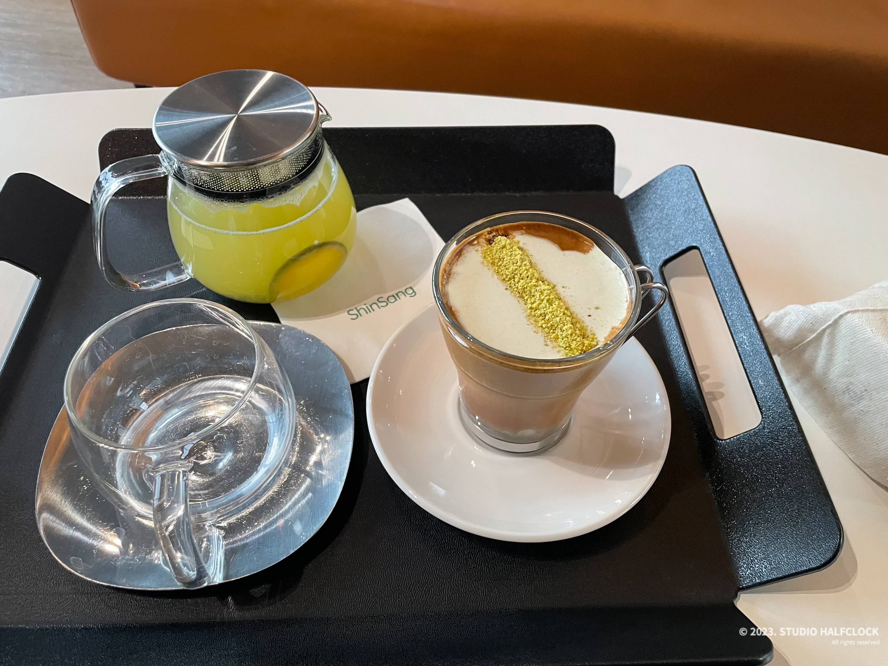시그니처메뉴는 꼭 시켜줘야 하니깐 피스타치오 라떼랑 제주청귤 따뜻한 차를 시켰다.