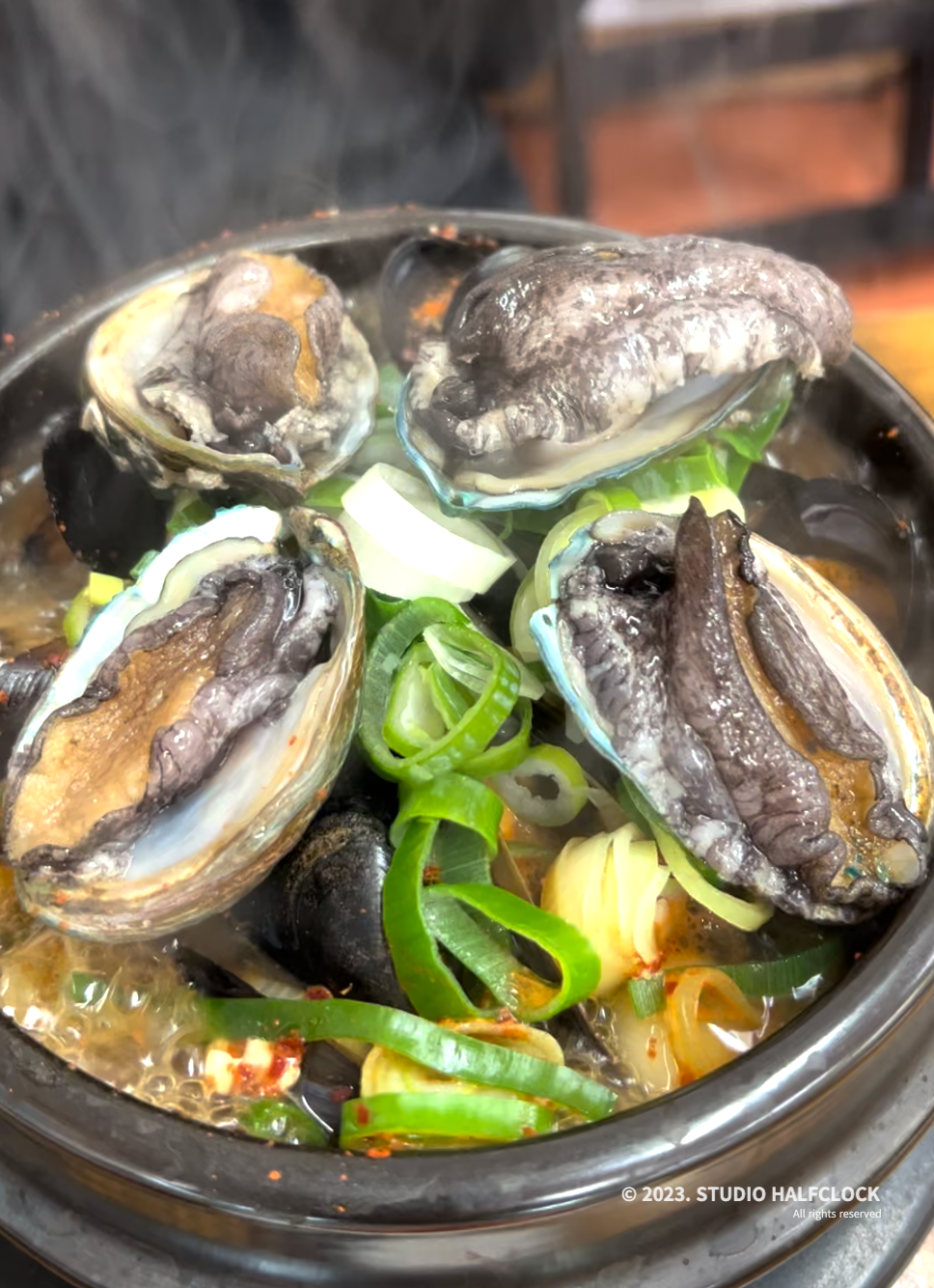 뚝배기에 전복과 다양한 해산물(새우, 홍합, 곤이, 조개, 게 등)들이 같이 나온다.