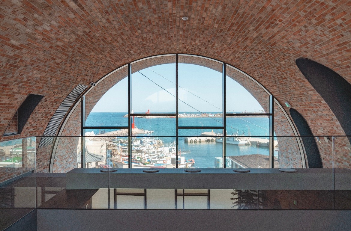 2층에서 전체 유리창으로 바다를 볼 수 있다. 내부 인테리어는 따뜻한 느낌을 주는 나무재료를 사용했고, 벽돌과 잘 어울렸다.