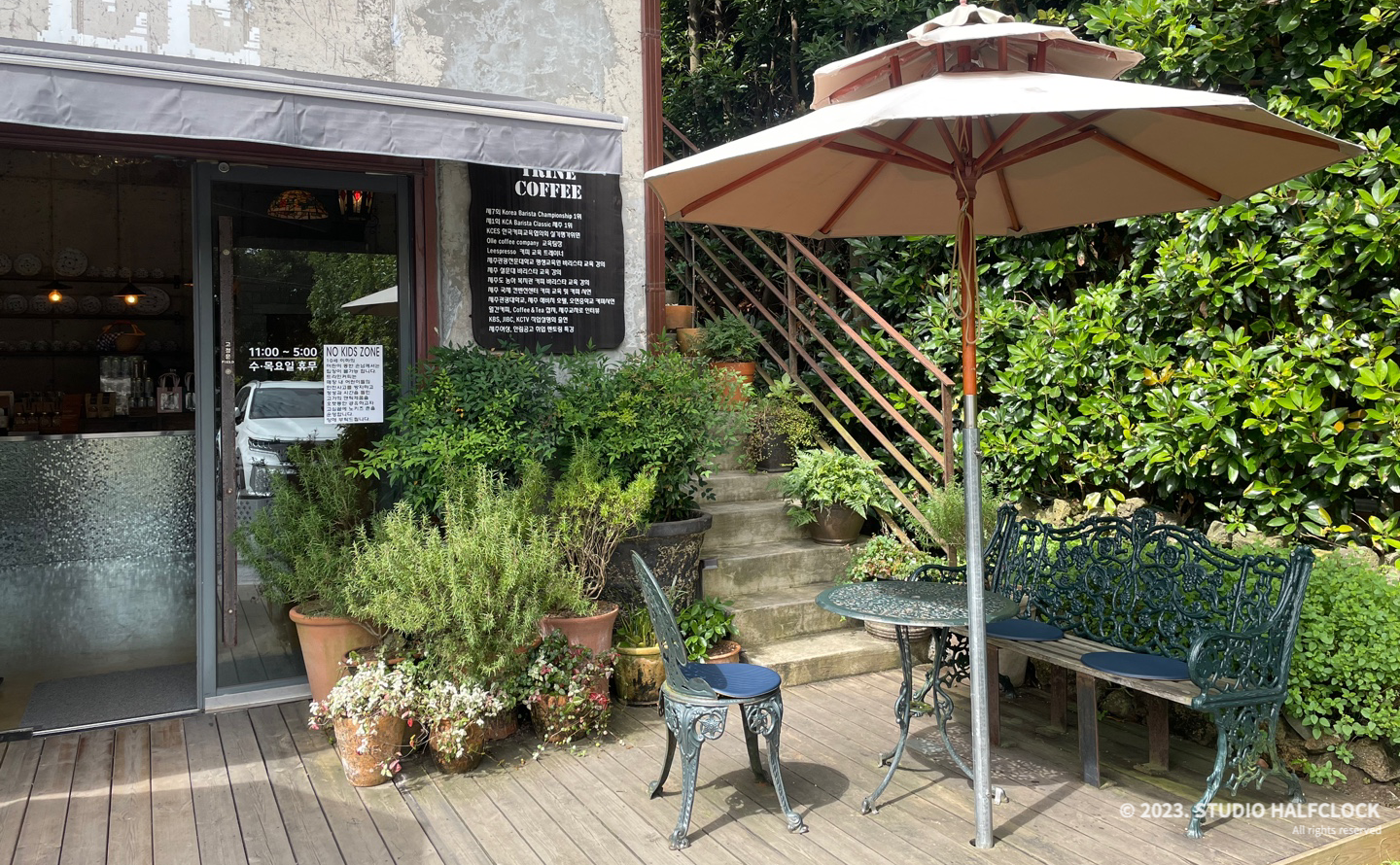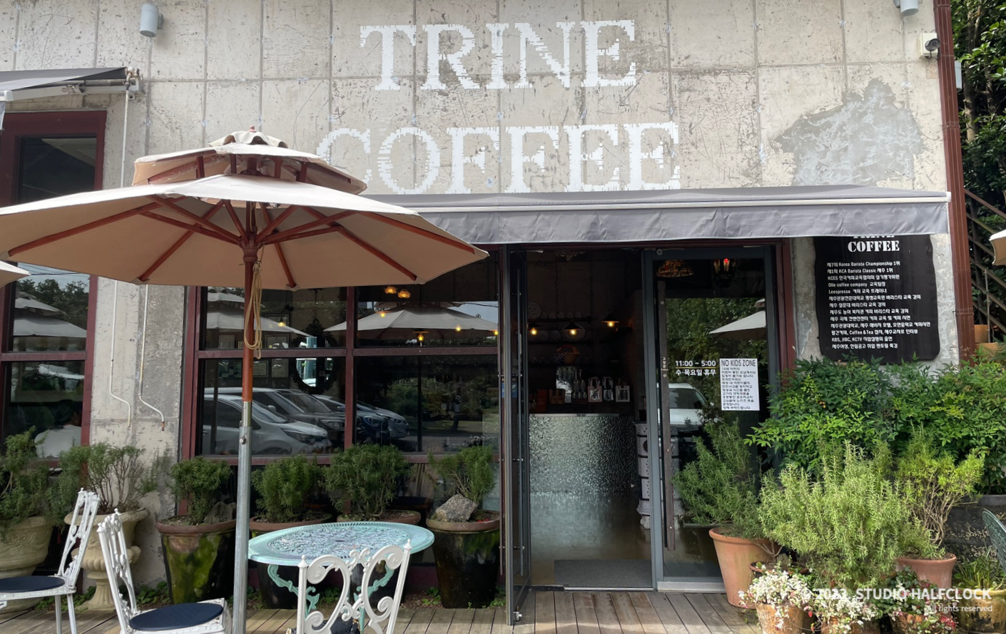 하겐다즈아몬드아포가토가 너무 맛있어서 벌써 두번째 방문하는 제주도의 커피맛집 트라인커피. 코리아 바리스타 챔피언쉽 1위 입상한 바리스타의 제주카페라고 합니다. 커피에 진심인게 느껴져요. 내부는 앤틱가구들로 꾸며져 있고 날씨가 좋다면 테라스에 앉아서 먹을수 있습니다. 앤틱가구들이 고가의 가구를 배치해 놓아서 고민끝에 노키즈존으로 운영한다고 해요. 10세 이하는 출입불가입니다.