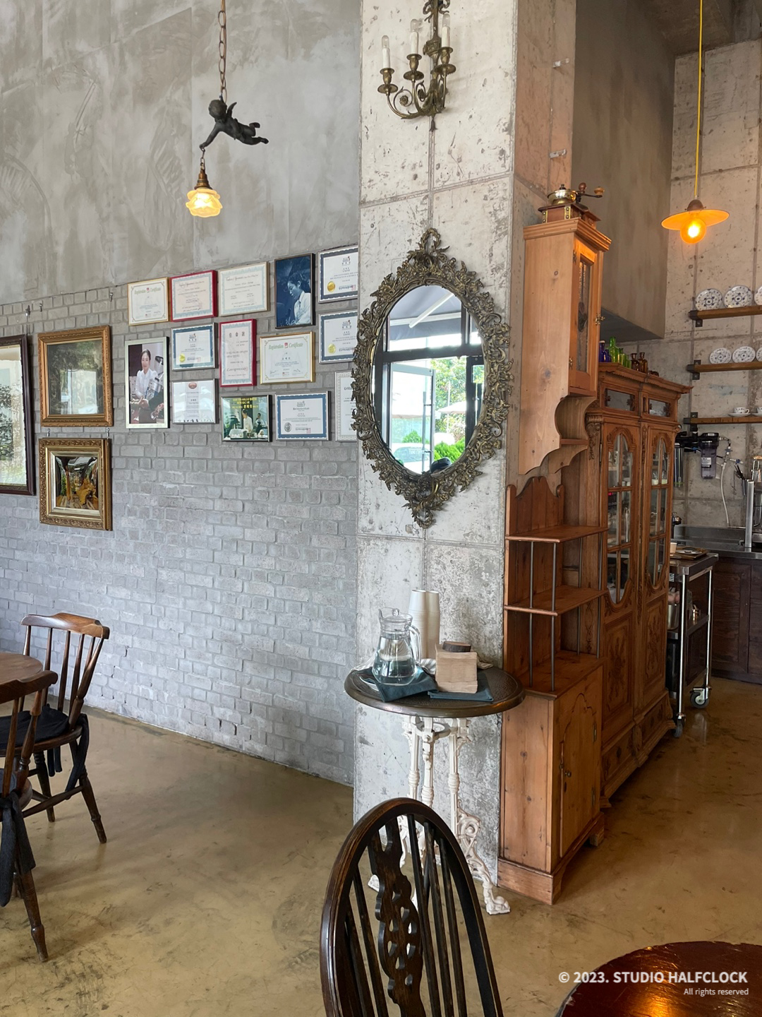 카페 내부에는 다양한 앤틱 가구들과 접시들이 있었다. 깨지기 쉽고 고가의 인테리어들이라서 노키즈존으로 결정하게 된듯 합니다. 접시를 전시해놓은 인테리어도 볼만했고 앤틱가구들을 보는 재미가 있었습니다. 앤틱한 거울과 조명들도 노출콘크리트와 잘 어울렸고 그 옆에는 커피 자격증과 상장들이 액자에 걸려있었다. 커피에 진심인 카페.