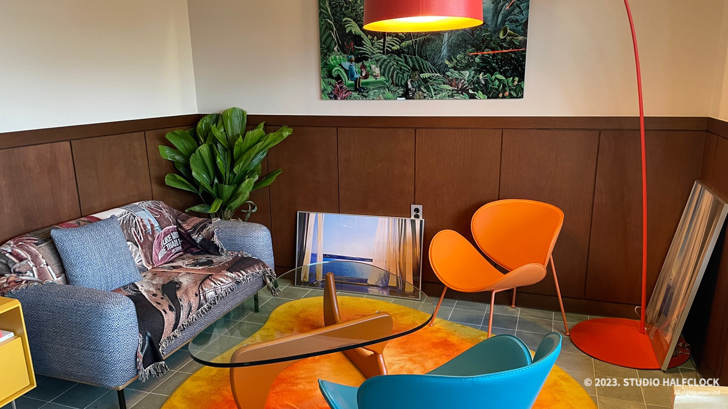 최근 인테리어 트렌드를 잘 반영한 것 같았어요. 무난한 색상의 타일과 그 공간을 컬러풀한 가구로 생기 있게 만들었습니다. 코로나 3년 동안 무난하고 정적인 공간이 유행이었다면, 코로나가 끝난 지금은 비비드 한 가구를 이용해서 조금 더 공간에 활기를 불어넣는 인테리어가 점점 많아지고 있습니다. 최근에 오픈해서 이런 트렌드를 잘 반영하고 있어서 좋았어요. 가구들을 보는 재미도 있었습니다.