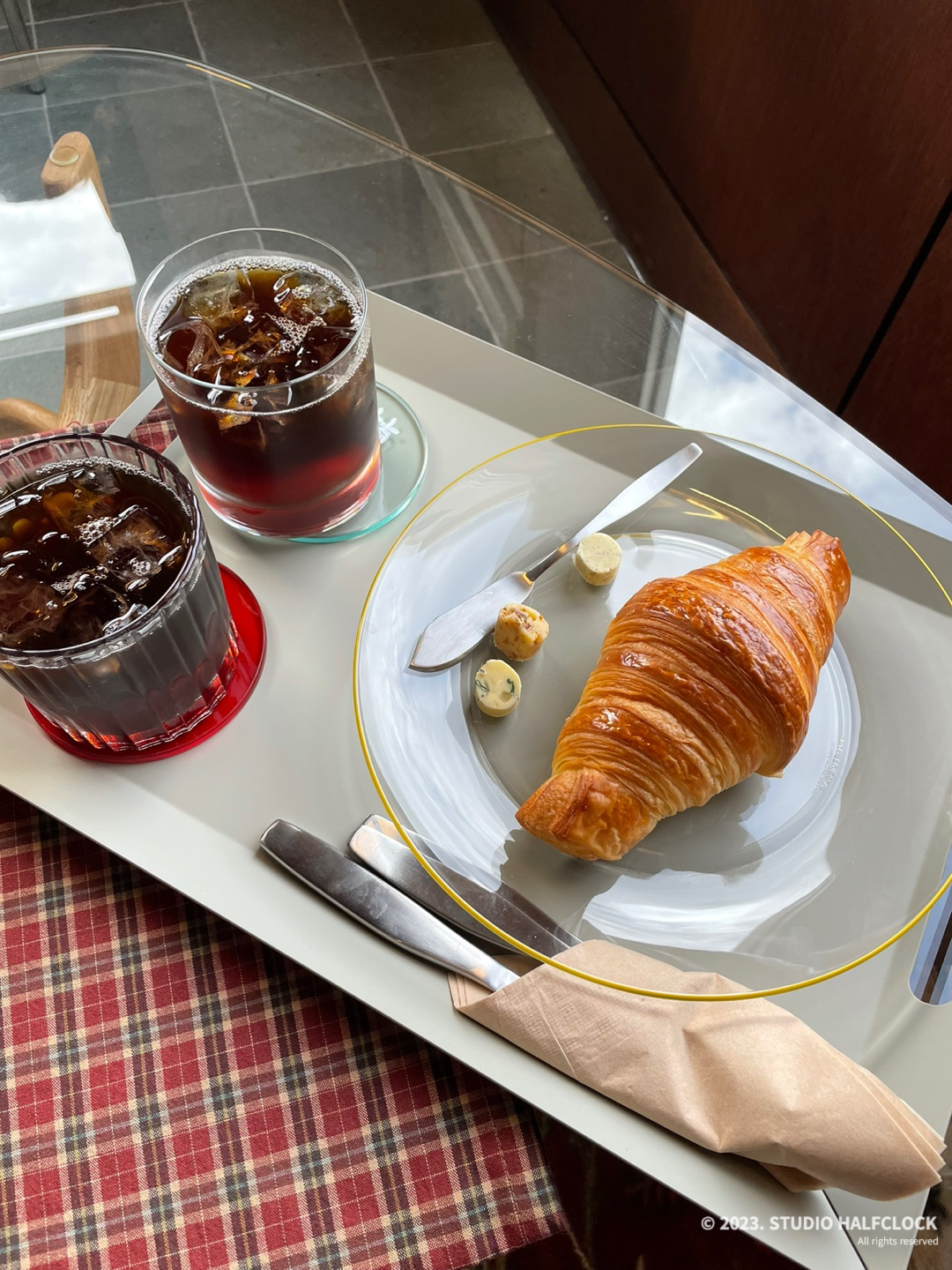 처음 봐서 신기했던 핸드드립커피머신, 커피를 잘 몰라서 그런지 이런 걸 보면 너무 신기하다. 커피는 헷갈릴 수 있으니 아래 컵받침에 메뉴를 적어주신다. 버터도 귀엽게 나오는.. 크로와상에 나오는 3개의 버터는 바닐라빈이 들어간 버터, 망고? 버터, 파? 버터 다 들었는데 이 정도밖에 기억이 안 나네요. 버터가 기본적으로 간이 되어있어서 크로와상이랑 먹기에 좋았습니다.