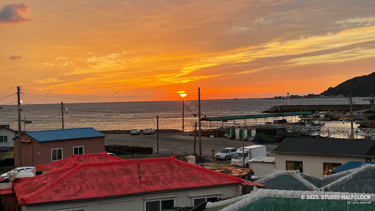 옥상 테라스에서 본 노을, 주변 건물들이 낮아서 가리지 않고 바다와 노을을 볼 수 있어서 좋았다. 이날 구름이 조금 많았는데 그래도 해가 지는걸 실시간으로 볼 수 있어서 좋았다. 날이 좋을 때 가면 더 좋을 것 같아요.